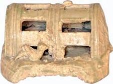 鬼灶: 灶身一端为方形火门,另一端上翘为排烟孔,台面近似三角形,两个火眼各置釜一只,状似小舟行驶。全器施淡青色釉,高 8厘米,长20厘米。
