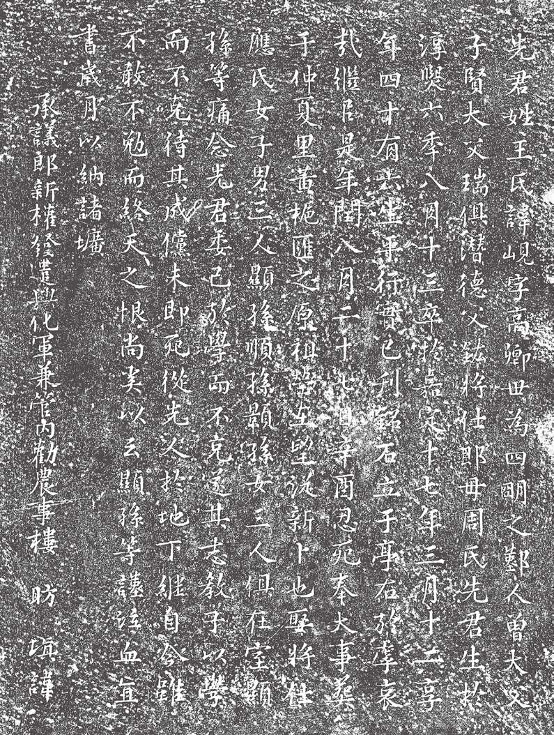 ,将仕郎。母周氏。先君生于淳熙六年八月十三,卒于嘉定十七年三月十二,享年四十有六。生平行实已刊铭石,立于亭右。於呼哀哉!继以是年闰八月二十七日辛酉忍死奉大事,葬于仲夏里黄栀汇之原。祖茔在望,从新卜也。娶将仕应氏女。子男三人,显孙、顺孙、颢孙。女三人,俱在室。显孙等痛念先君,委己于学而不克遂其志,教子以学而不克待其成,倘未即死从先人于地下,继自今,虽不敢不勉,而终天之恨,尚奚以云。显孙等谨泣血直书岁月以纳诸圹。