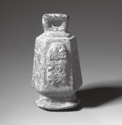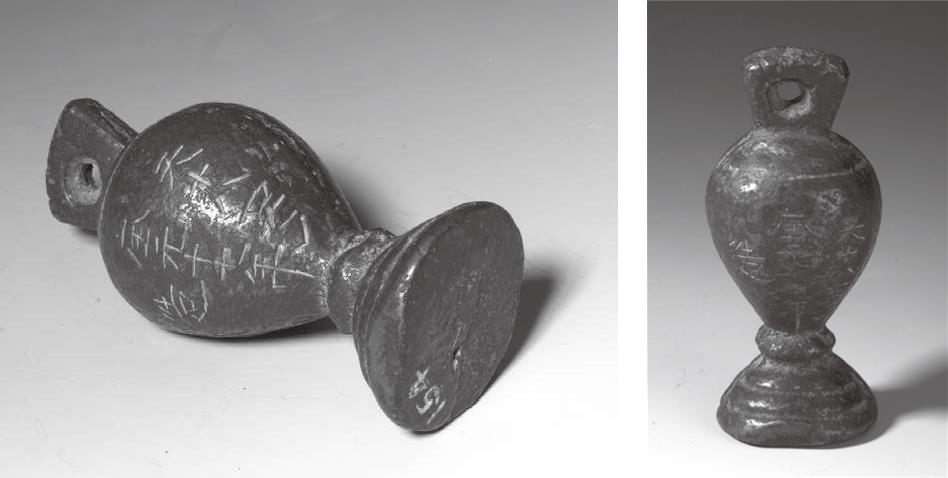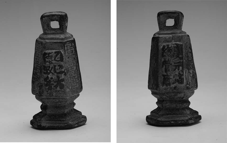 按:1982年洞桥镇业余文保员徐水道捐赠,高9.6厘米。权身似水滴形,文字凿刻于权身之上,分三列。