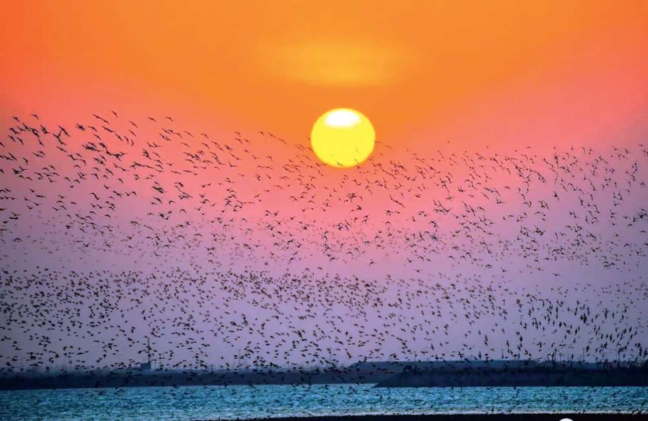 前几年的卫星跟踪研究显示,新西兰的斑尾塍鹬会通过7~8天的不间断飞行越过太平洋,直达鸭绿江口,出发时积累的脂肪由于万余公里的连续飞行而消耗殆尽,鸭绿江口湿地为众多远渡重洋的涉禽提供了丰富的食物。经过约一个月的休整、补充后,这些水鸟继续北上,到美国的阿拉斯加繁殖地去繁育后代。这一期间还有世界极度濒危的物种勺嘴鹬、濒危物种小青脚鹬等迁徙路过。鸭绿江口湿地鸟浪飞舞,早晨和傍晚是观鸟天文大潮期,艳阳当空,丹东鸭绿江口湿地便幻化成了黄金海岸,数万只鸻鹬类涉禽与金晖共舞,构成了醉美的生态景观。