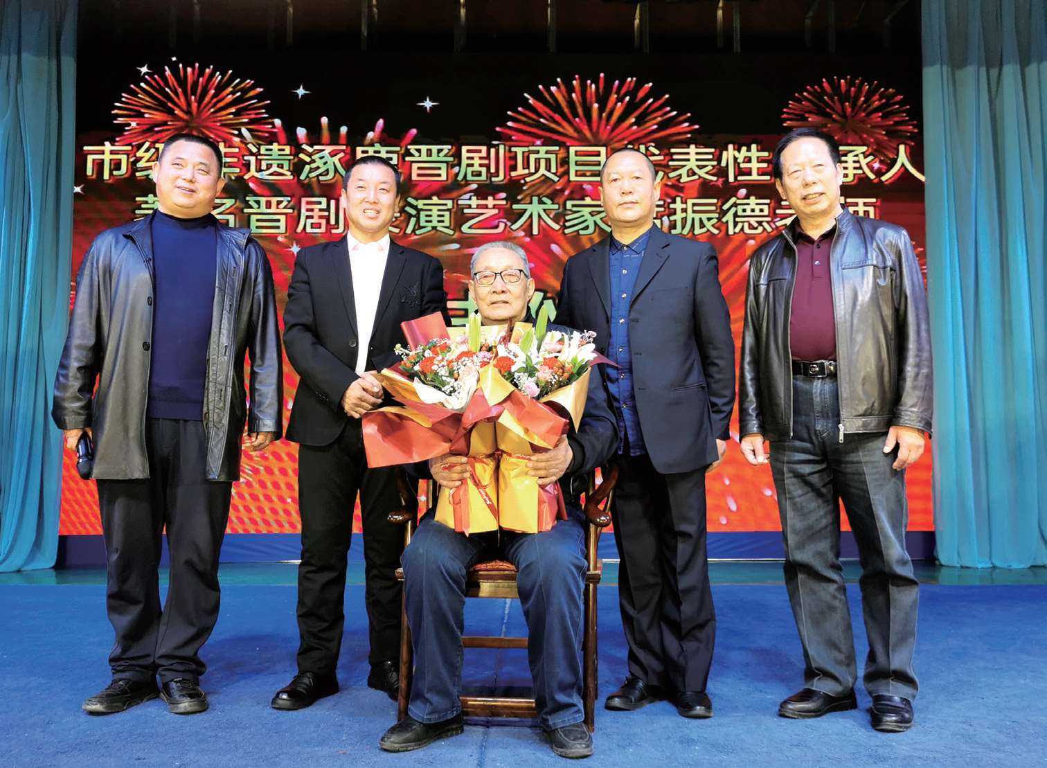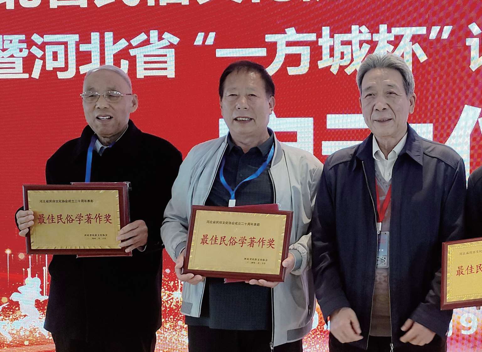 《山西梆子在涿鹿(一、二)》获河北省民俗文化协会成立二十周年表彰活动“最佳民俗学著作奖”,作者霍汉清(中)与河北省民俗文化协会原会长袁学骏(右)在颁奖仪式上。拍摄于2024年4月9日