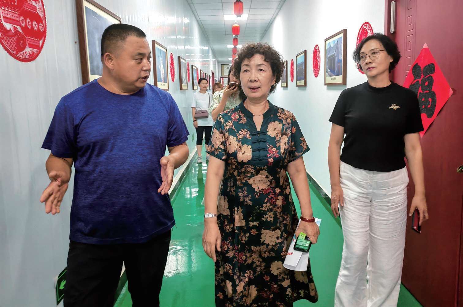 谷晓云(左)向中国散文学会主席叶梅(中)和张家口市文联主席王芳(右)介绍涿鹿晋剧博物馆情况,拍摄于2022年8月8日