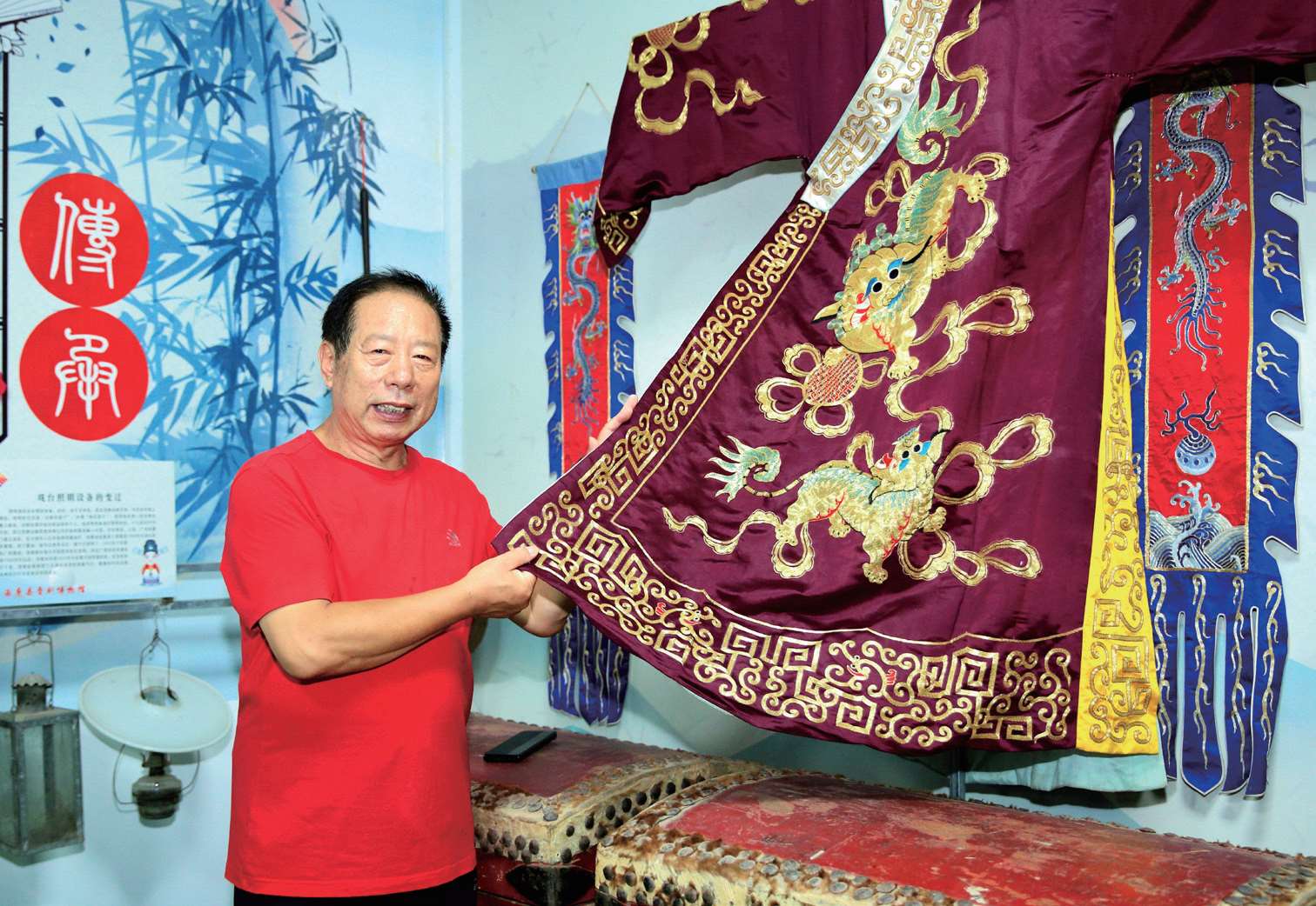 作者霍汉清向游客介绍晋剧博物馆藏品,曹秀丽拍摄于2024年8月24日