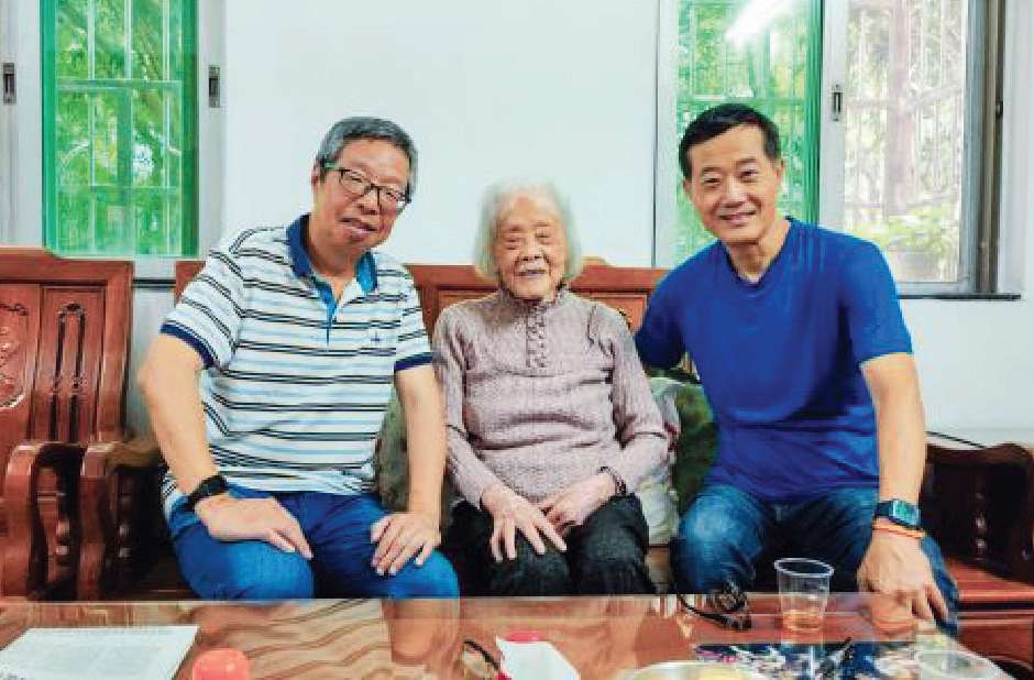 阳春市漠阳江红色文化研究会副秘书长陈立(左)与马平的儿子马军(右)一起前往102岁抗日巾帼英雄梁文坚(本书总顾问)家慰问