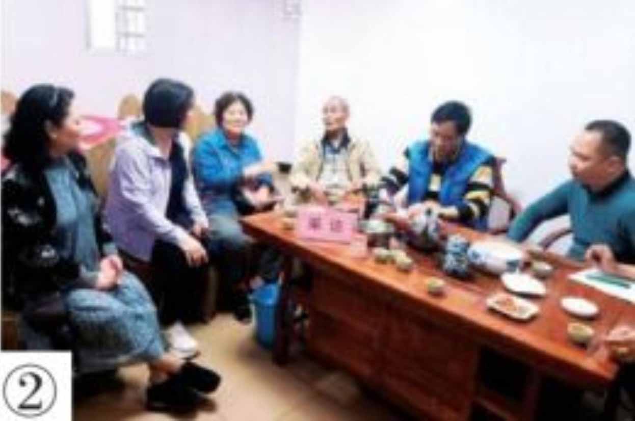 ②阳春市漠阳江红色文化研究会采编人员与欧圣聪儿子欧西(右三)、女儿欧凯(左二)等进行采访座谈