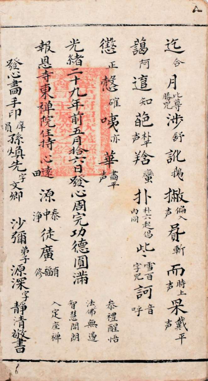 邑报恩寺藏有清光绪二十六年(1900 年)抄本《慈悲弥陀法忏》全卷。经折装,半折 4 行,每行 14 字,纵 23 厘米,横 11 厘米。卷尾题“光绪庚子年二月拾六日写完,东禅院沙弥弟子源深字净清书,徒广福”。