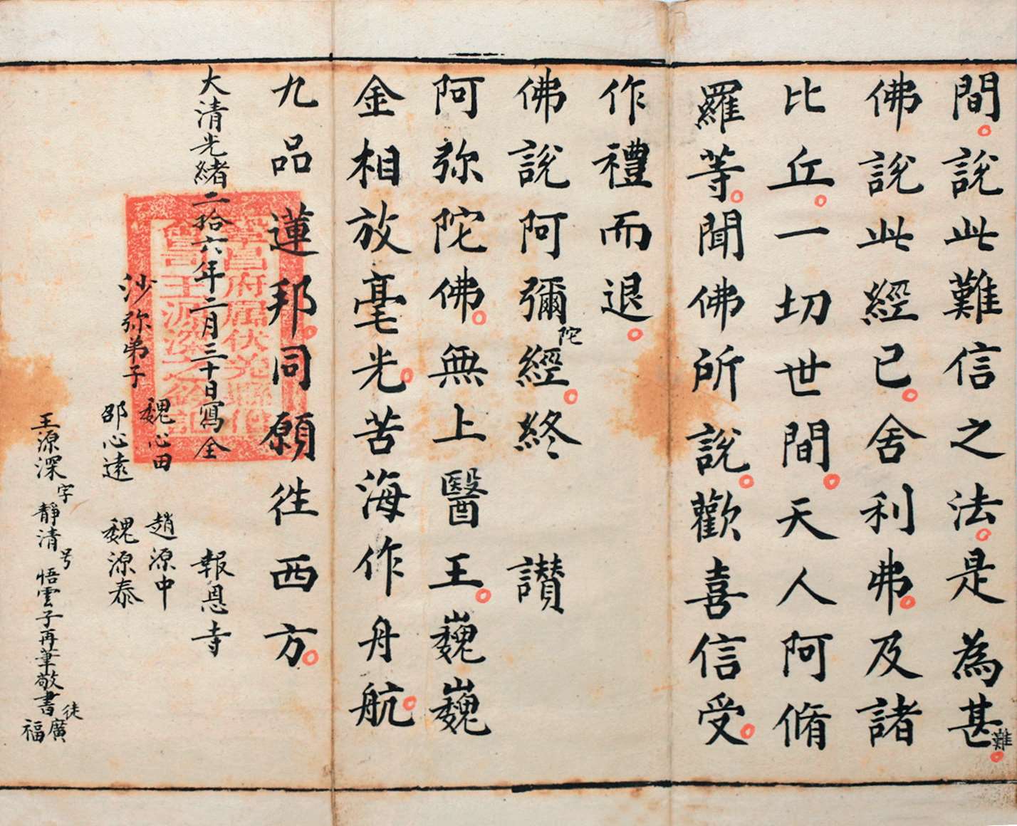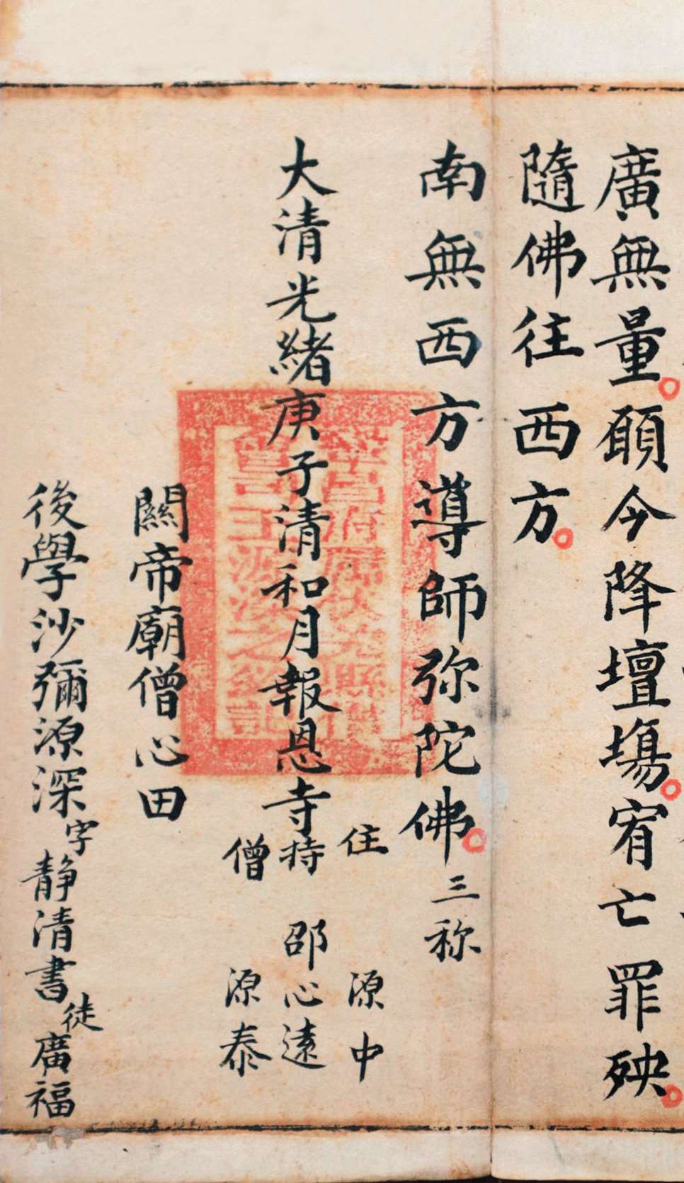邑报恩寺藏有清光绪二十六年(1900 年)抄本《佛说阿弥陀经》一卷。经折装,半折 4 行,每行 10 字,纵 22.5 厘米,横 11 厘米。卷尾题“大清光绪二拾六年二月三十日写全。报恩寺沙弥弟子魏心田、邵心远、赵源中、魏源泰。王源深,字静清,号悟云子,再笔敬书,徒广福”。