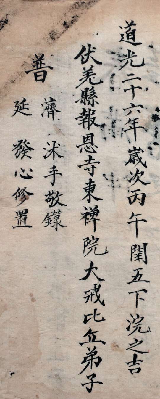 邑报恩寺藏有清道光二十六年(1846 年)抄本《豫告规目》一部。线装本,每页 6 行,每行 17 字,纵 20 厘米,横 13.2 厘米。卷尾题“道光二十六年岁次丙午闰五下浣之吉,伏羌县报恩寺东禅院大戒比丘弟子普济沐手敬箓,普延发心修置”。