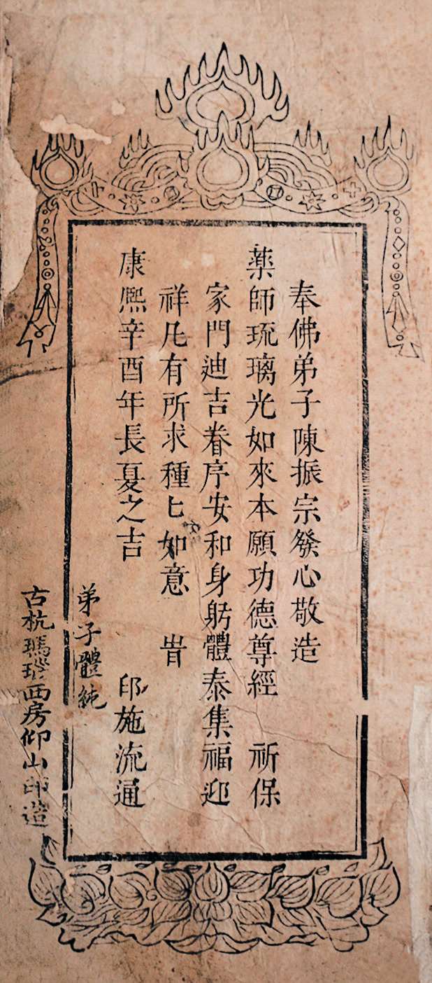 邑报恩寺藏有清康熙二十年(1681 年)刻本《药师琉璃光如来本愿功德经卷》一卷。经折装,半折 5 行,每行 15 字,纵 25 厘米,横 10 厘米。卷尾题“奉佛弟子陈振宗发心敬造……康熙辛酉年长夏之吉 印施流通。弟子体纯。古杭玛瑙西房仰山印造”。