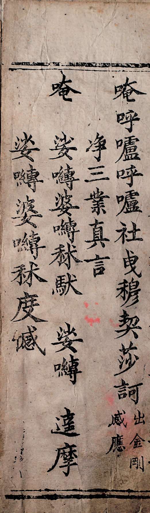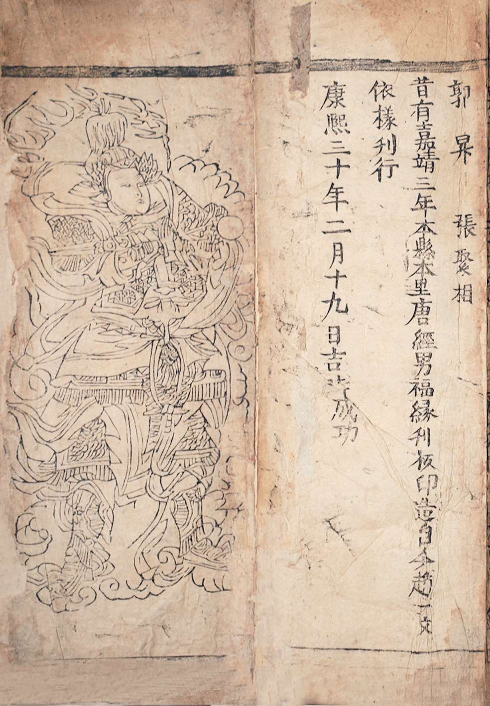 经折装,半折4 行,每行 11字,纵 26.5 厘米,横 12 厘米。卷尾题“昔有嘉靖三年本县本里唐经男福缘刊板印造,自今赵一文依样刊行。康熙三十年二月十九日吉时成功”。