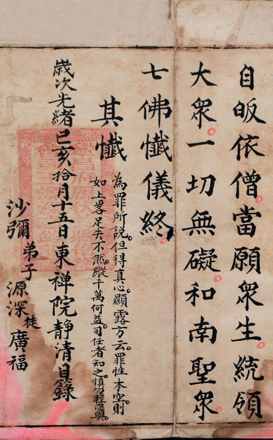 邑报恩寺藏有清光绪二十五年(1899 年)抄本《慈悲七佛宝忏仪》全卷。经折装, 半折 4 行,每行 10 字,纵 22.5 厘米,横 11 厘米。卷尾题“岁次光绪己亥拾月十五日,东禅院静清目箓,沙弥弟子源深,徒广福”。