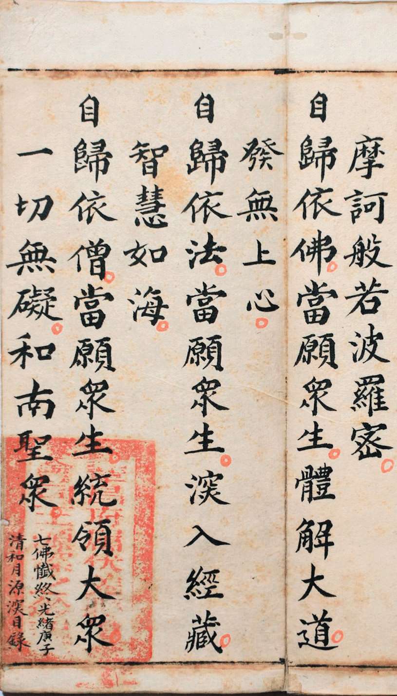 邑报恩寺藏有清光绪二十六年(1900 年)抄本《慈悲七佛宝忏》全卷。经折装,半折 5 行,每行 12 字,纵 22.5 厘米,横 11 厘米。卷尾题“光绪庚子清和月,源深目录”。