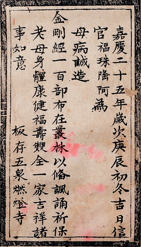 邑报恩寺藏有清嘉庆二十五年(1820 年)刻本《金刚般若波罗蜜经》一卷。经折装,半折 5 行,每行 15 字,纵 24 厘米,横 11 厘米。卷尾题“嘉庆二十五年岁次庚辰初冬吉日,信官福珠隆阿为母病诚造金刚经一百部,布在丛林,以备讽诵,祈保老母身体康健,福寿双全,一家吉祥,诸事如意。板存五泉燃灯寺”。