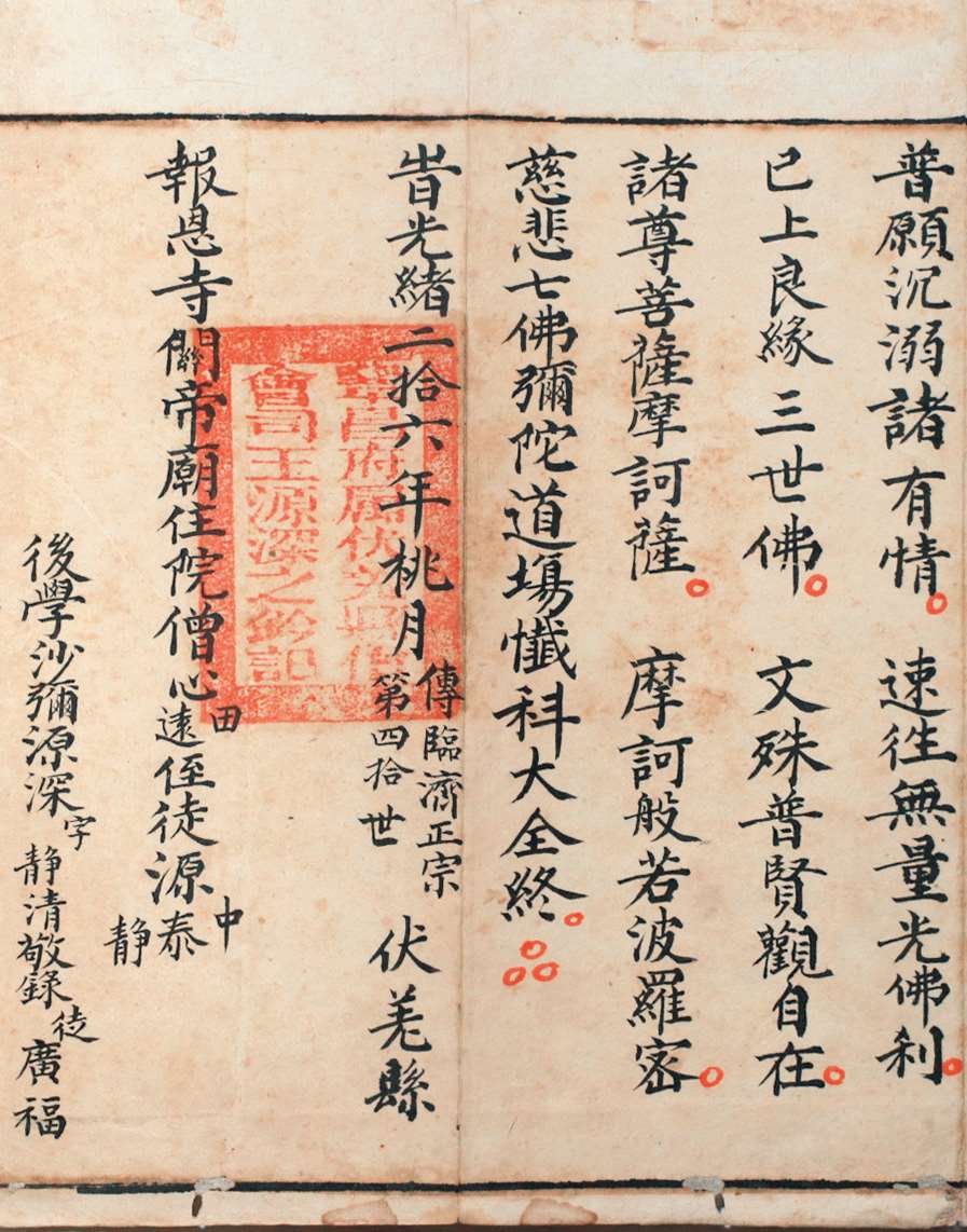 邑报恩寺藏有清光绪二十六年(1900 年)抄本《慈悲七佛弥陀道场忏法科》全卷。经折装,半折 4 行,每行 14 字,纵 22.5 厘米,横 11 厘米。卷尾题“时光绪二拾六年桃月,传临济正宗第四拾世,伏羌县报恩寺关帝庙住院僧心田、心远,侄徒源中、源泰、源静,后学沙弥源深字静清敬录,徒广福”。