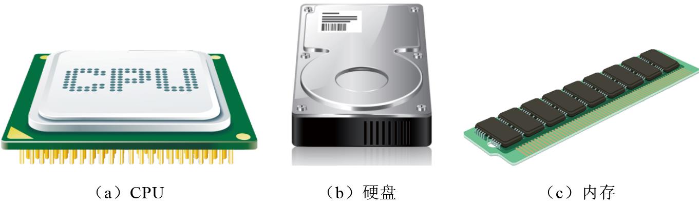 计算机里有几个重要部件——CPU、硬盘和内存,如图2.1所示。