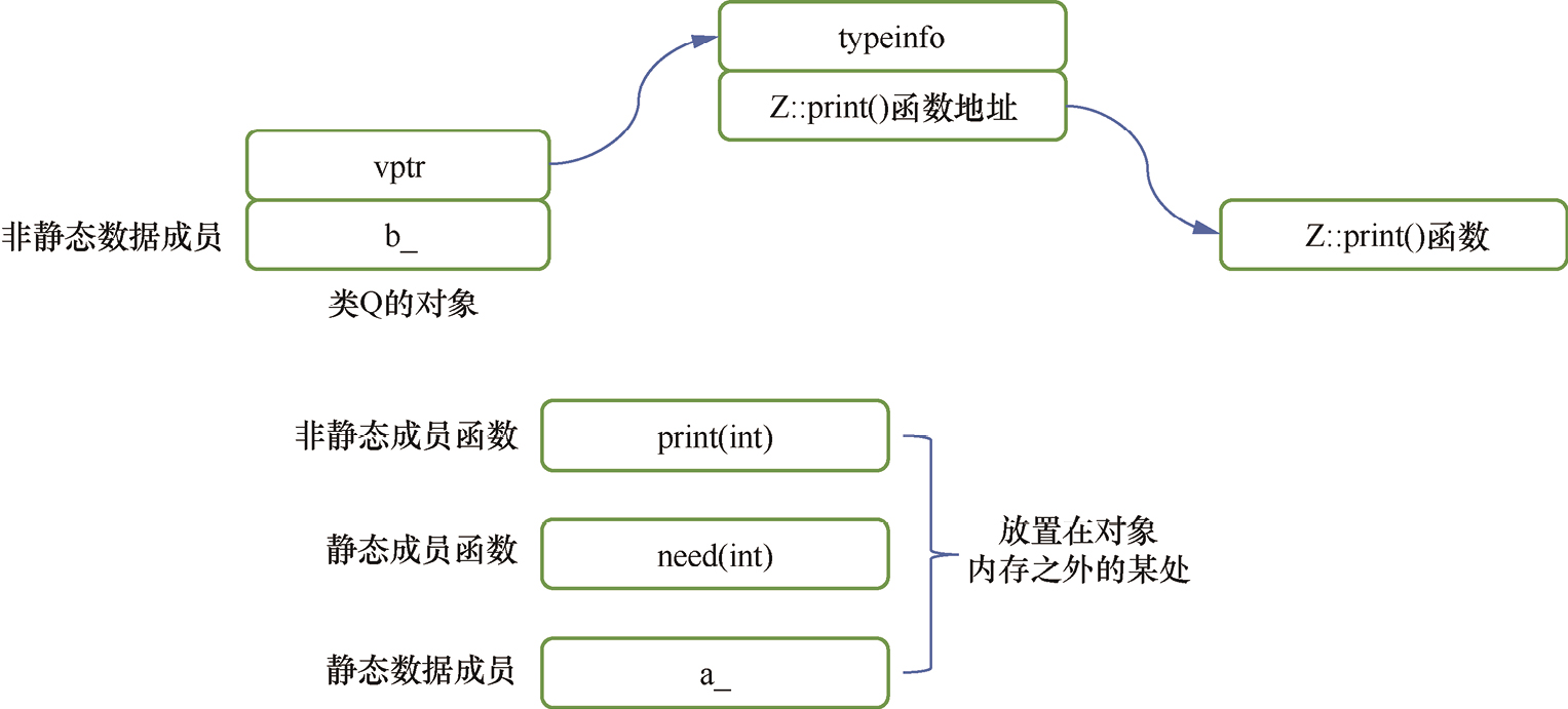 为了实现多态,C++又引进了运行时类型识别(Run Time Type Identification,RTTI),此时若类Z公共继承自类Q,则类Z的对象的内存布局如图1-2所示。