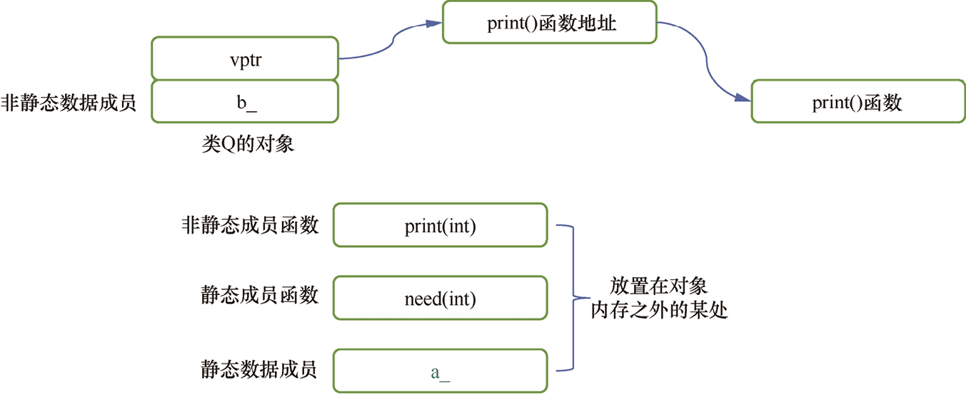 根据“C++之父”本贾尼·斯特劳斯特卢普(Bjarne Stroustrup)的《C++语言的设计和演化》一书,在实现C++多态时,编译器会将对象中的虚函数的地址搜集起来并放到一个表格中,然后在对象中增加一个成员vptr来指向这个拥有虚函数地址的表格;对于类的其他成员函数(包括静态成员函数和非静态成员函数),编译器将其放置在对象内存(即栈或堆中为了存放该对象而分配的内存)之外的某处,一般为进程的代码区;对于定义在类中的非静态数据成员,编译器将其放置在对象内存之中;对于静态数据成员,编译器将其放置在对象内存之外的某处,一般为进程的数据区。例如,更改类Q的定义如下: