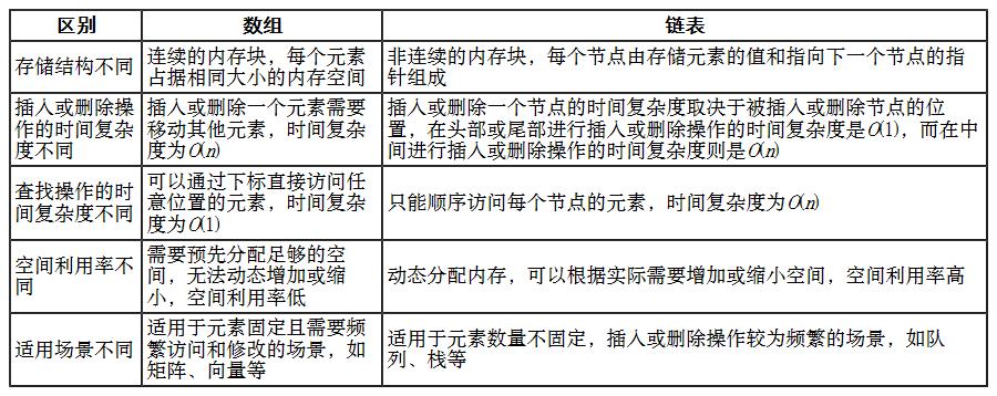 数组和链表的区别主要包括存储结构、操作的时间复杂度、空间利用率和适用场景等方面,具体区别如表2-1所示。