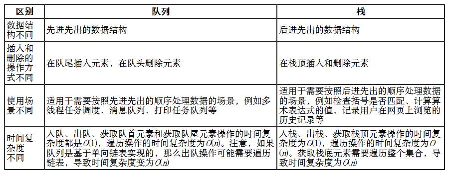 在Java中,队列和栈的区别主要包括数据结构、插入和删除的操作方式、使用场景和时间复杂度等方面,具体区别如表2-5所示。