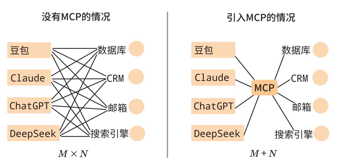 在软件开发领域存在一个难题,我们可以称其为“ M × N 问题”:当多个应用( M )需要对接多个外部扩展( N )时,如果缺乏统一的标准,每一对组合都得单独适配。这意味着每新增一个应用或一个扩展,整体的集成工作量就会按照 M × N 的复杂度增长。例如,从3个应用和4个扩展增加到4个应用和5个扩展时,工作量会从适配12个连接关系增加到适配20个连接关系。