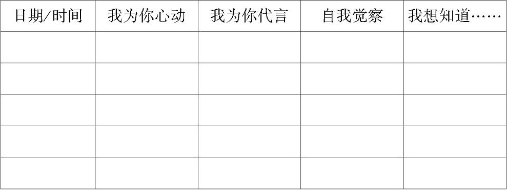 请根据自己的实际情况,制定阅读记录表,包括时间,你共情同理到哪个人物的什么瞬间(“我为你心动”),你设身处地捕捉到该瞬间这个人物的什么感受(“我为你代言”),等等。也许这类人生瞬间你自己也曾亲历或耳闻目睹(“自我觉察”),也可能这个瞬间和这种感受激发了你的好奇心和探究欲,使你产生了阅读期待(“我想知道……”)。请边读边简要记录你的阅读进程和初读收获,形式不限,下表仅供参考。