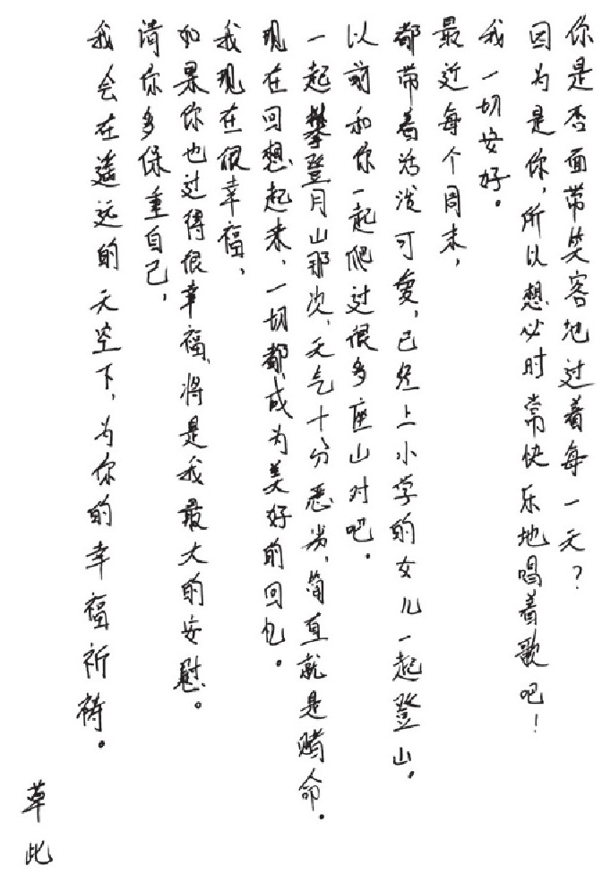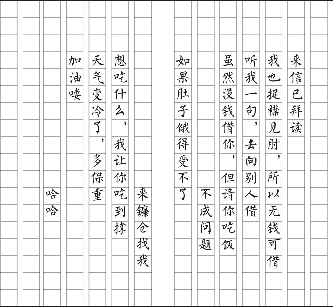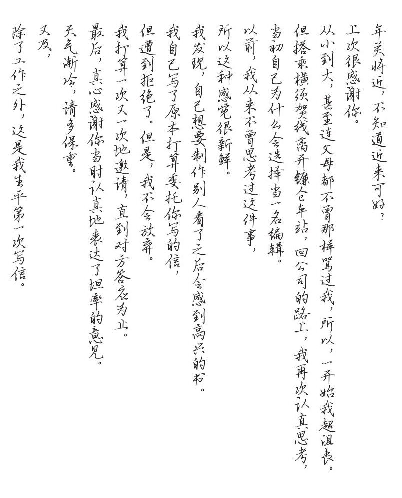 “我才要感谢你。过去我一直误以为,字之所以写得丑,是因为写字的人的内心如此;但认识你之后,才知道这种想法是偏见,所以,真的很对不起。”