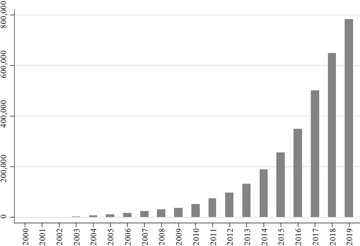图1-1 2000—2019年中国工业机器人总保有量(台)变化趋势