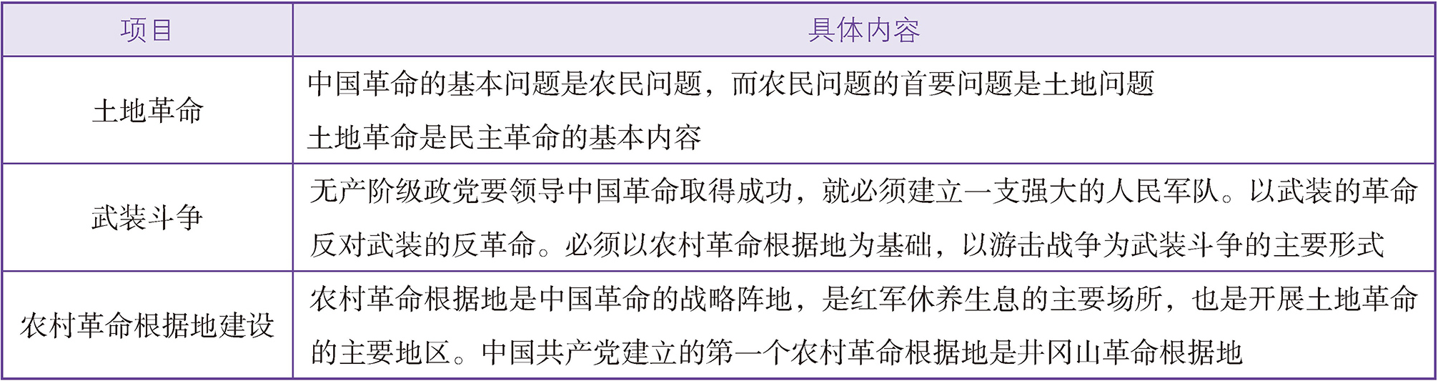 土地革命是民主革命的基本内容;武装斗争是中国革命的主要形式,是农村根据地建设和土地革命的强有力保证;农村革命根据地是中国革命的战略阵地,是进行武装斗争和开展土地革命的依托(见下表)。