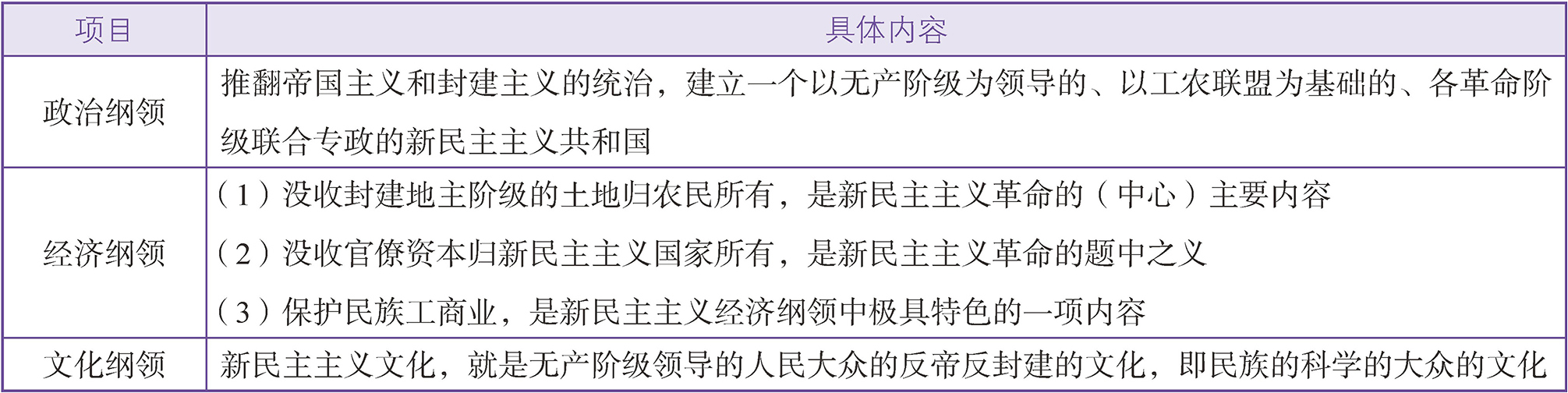 1940年,毛泽东同志在《新民主主义论》中阐述了新民主主义的政治、经济和文化。1945年,毛泽东同志在党的七大所作的《论联合政府》政治报告中,进一步把新民主主义的政治、经济和文化与党的基本纲领联系起来,进行了具体阐述,具体内容如下表所示: