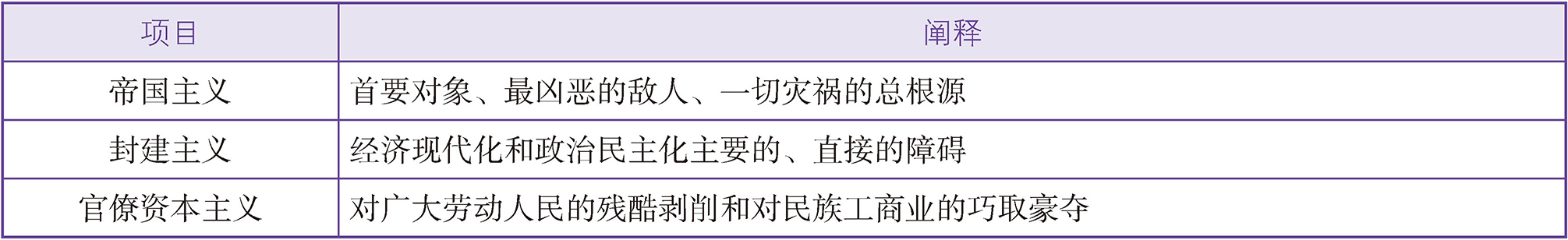 分清敌友,这是革命的首要问题。近代中国社会的性质和主要矛盾,决定了中国革命的主要敌人就是帝国主义、封建主义和官僚资本主义(见下表)。