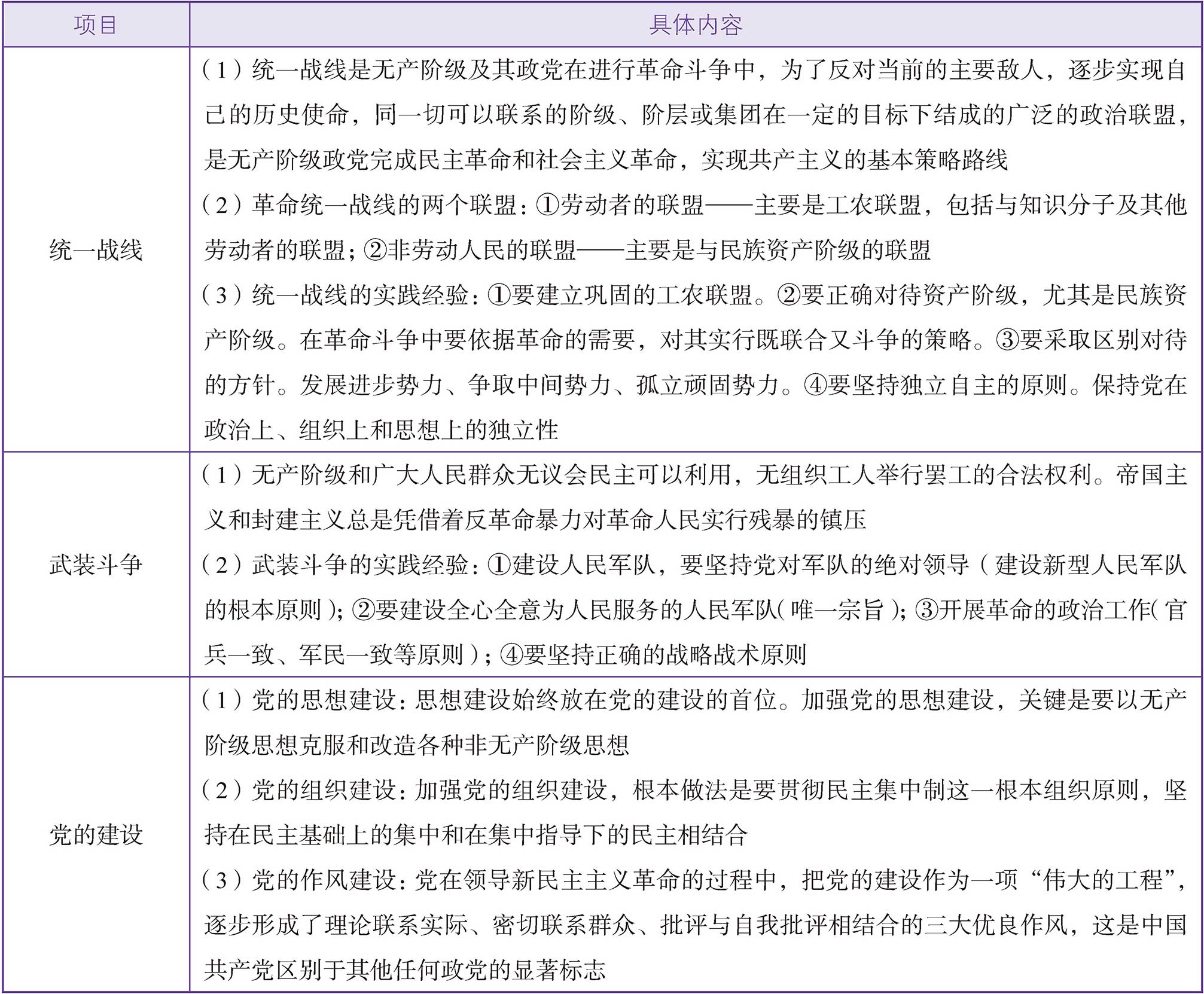 毛泽东在《〈共产党人〉发刊词》一文中指出:统一战线、武装斗争、党的建设,是中国共产党在中国革命中战胜敌人的三个法宝,三个主要的法宝(见下表)。