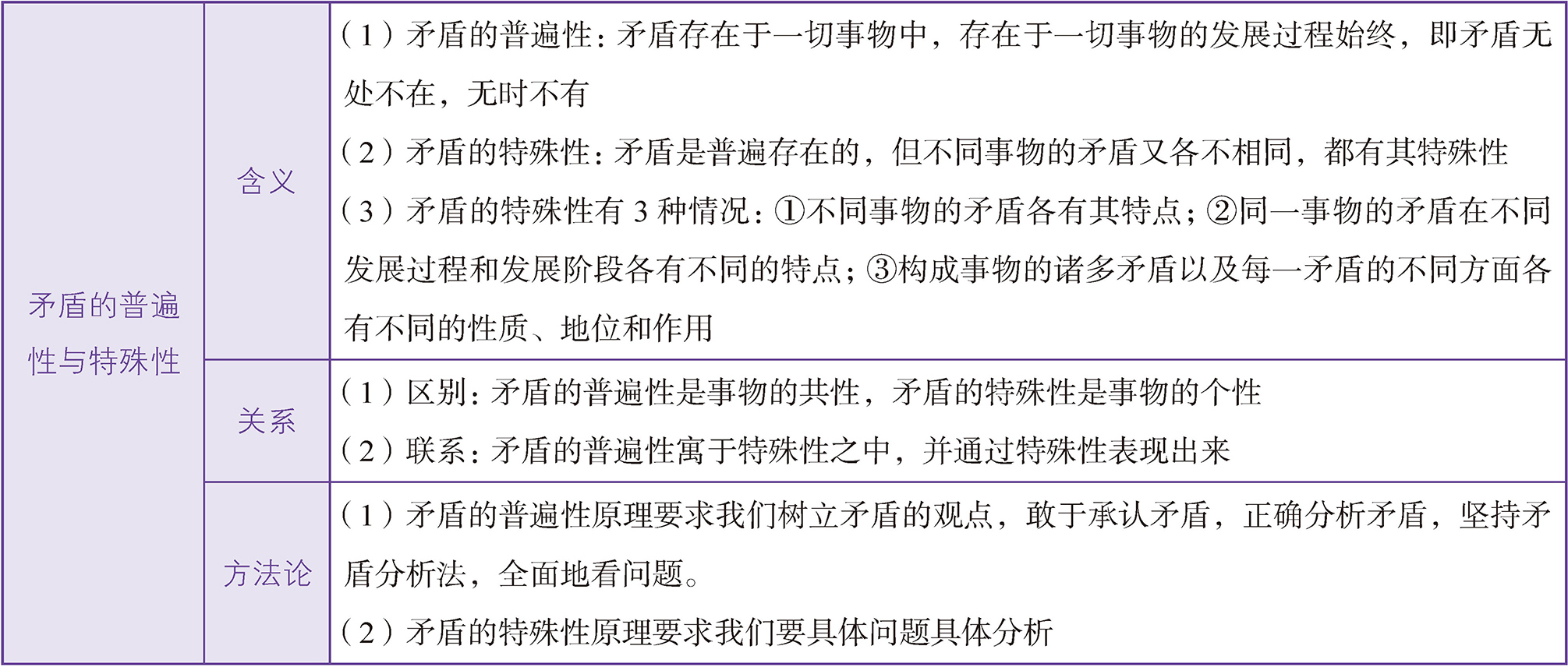 矛盾的普遍性与特殊性辩证关系的原理,是矛盾问题的精髓(见下表)。