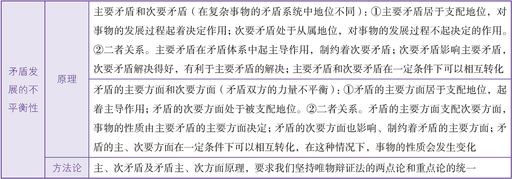 矛盾发展的不平衡性是矛盾特殊性的重要表现。它主要表现为两种情形:一种是主要矛盾和次要矛盾的不平衡;另一种是矛盾的主要方面和次要方面的不平衡(见下表)。