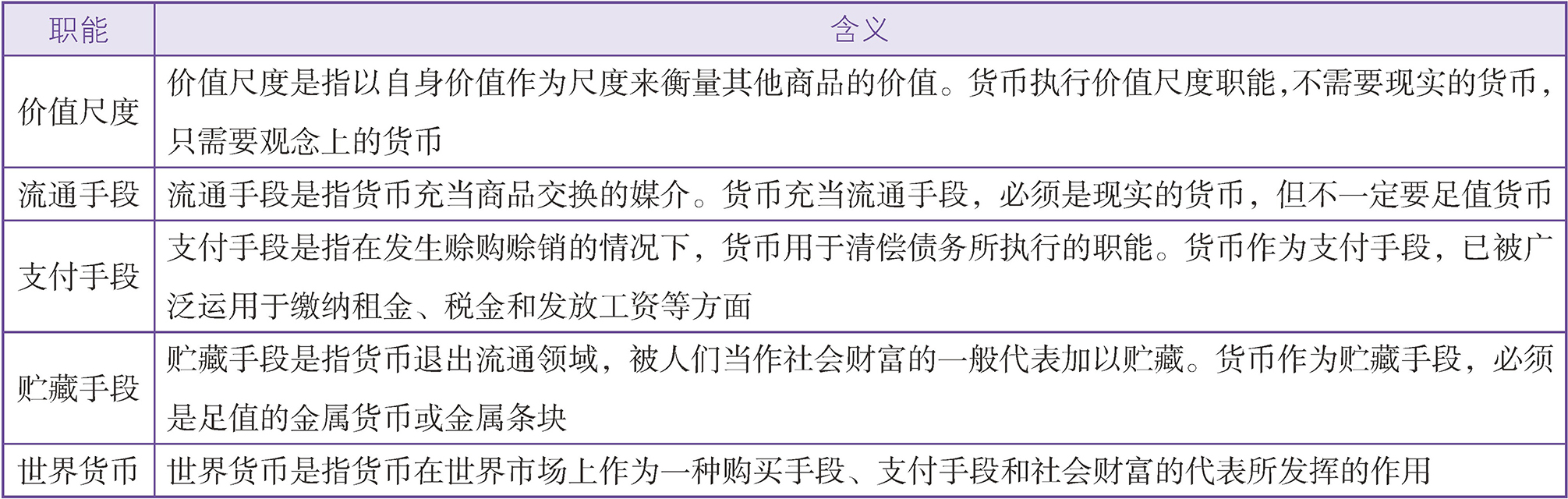 货币的职能是由货币的本质决定的,又是货币本质的具体体现。货币具有五大职能,其含义如下表所示: