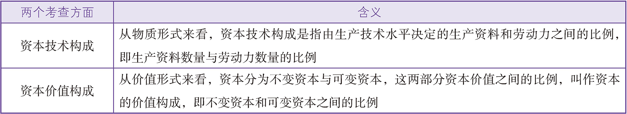 为了深入研究资本积累对资本主义发展的影响,马克思创造性地提出资本有机构成范畴。资本的构成包括资本技术构成和资本价值构成,即资本的构成可以从物质形式和价值形式两个方面考查,具体内容如下表所示: