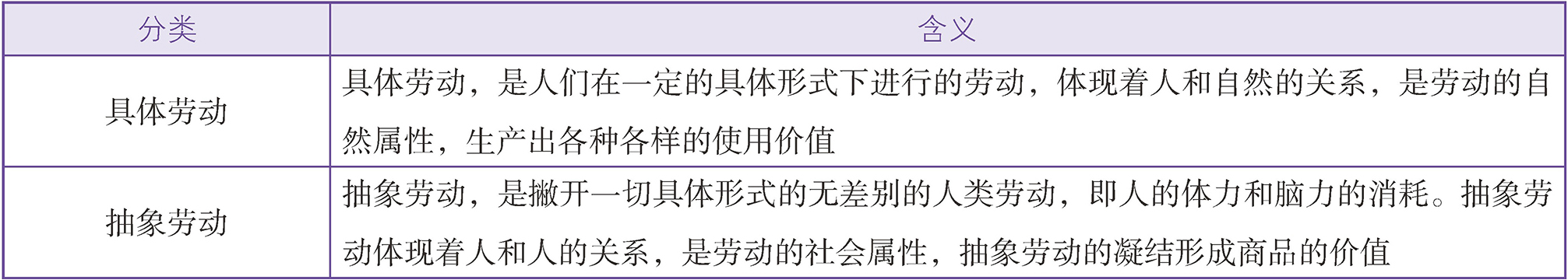 商品是劳动产品,生产商品的劳动可分为具体劳动和抽象劳动(见下表)。