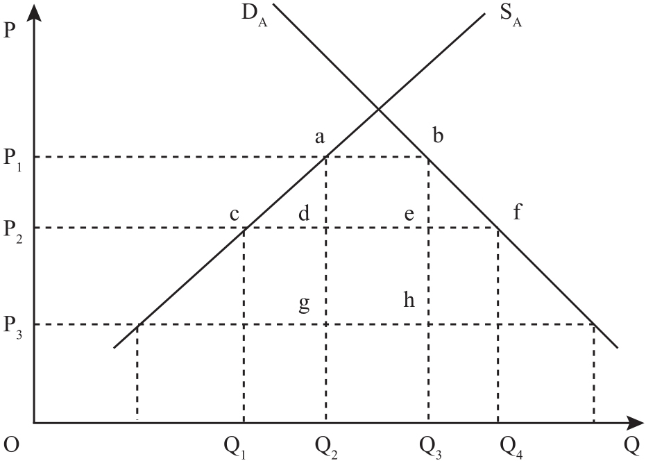假定存在A国、B国、C国,贸易商品m。如图2-1所示,横轴Q代表商品m的供需数量,纵轴P代表商品m的供需价格;D A 和S A 分别代表A国的需求曲线和供给曲线;P 1 、P 2 、P 3 分别代表A国、B国、C国的不同出售价格;P 1 -P 3 代表A国针对每单位进口商品m所征收的关税。假定只有A国和B国会建立关税同盟ABCU,那么在ABCU建立之前,由于P 3 小于P 2 ,P 3 +(P 1 -P 3 )仍然小于P 2 +(P 1 -P 3 ),故按照西方经济学的经济人假设,A国必然只会从C国进口商品m来使其国内对该产品的供需达到均衡,且进口数量为Q 3 -Q 2 。这时分析A国的贸易收益可知,A国将会获得四边形abgh面积大小的关税收益。