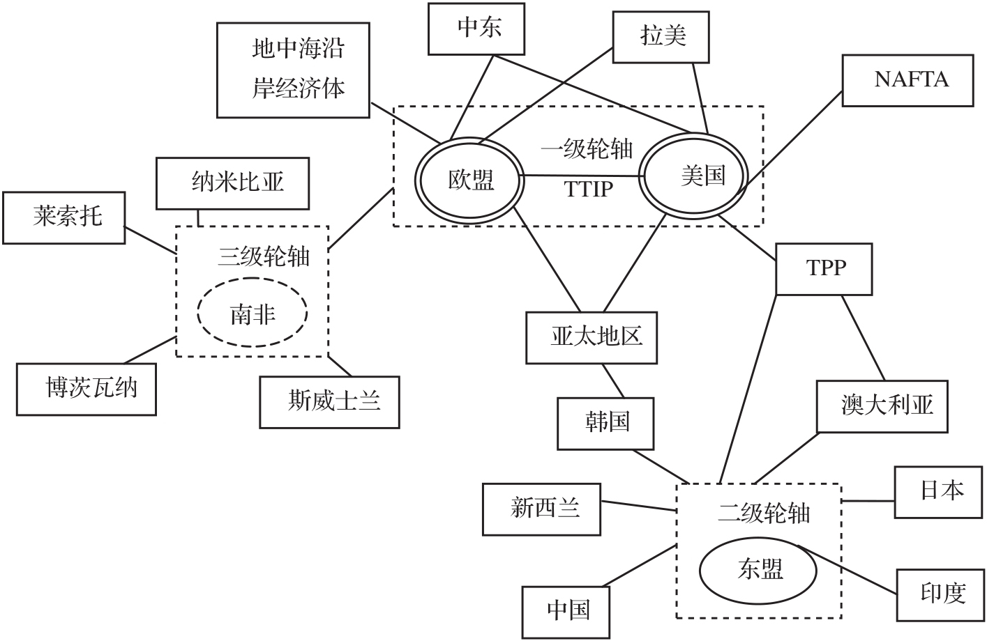 “轮轴国”常是全球性或区域性的“大国”,而“辐条国”更多是充当“小国”角色,但也有例外,比如在以东盟为轮轴的一系列自贸区当中,其合作伙伴,诸如中国、日本、印度、澳大利亚等均在综合实力方面强于或者不次于东盟的整体实力,但东盟巧妙运用“大国制衡”的政治和外交策略,坐实这些自贸区成员的“轮轴国”和“驾驶员”地位。从全球范围看“轮轴国”既可能是某一个国家,比如美国、南非、日本等,亦可能是某一区域性合作组织,比如欧盟、东盟、海湾阿拉伯国家合作委员会(以下简称海合会)等。“轮轴国”也存在等级差异,根据“轮轴国”的驾驭协定数量、综合实力、全球影响力、辐射地理广度等,至少可将其依次划分为垂直型的三级,分别是“一级轮轴”“二级轮轴”“三级轮轴”。当前全球的“一级轮轴”主要是欧盟和美国,“二级轮轴”有东盟等,“三级轮轴”有南非等(见图2-4)。此外,“轮轴国”与“辐条国”的地位在特定条件下是可以互换的,以东盟为例,若欧盟—东盟自贸区达成,那么东盟就属于“一级轮轴”欧盟的一个“辐条国”,而前面所述在东亚、东南亚、南亚、大洋洲区域范围内,东盟占据着区域经济合作的“轮轴国”地位。