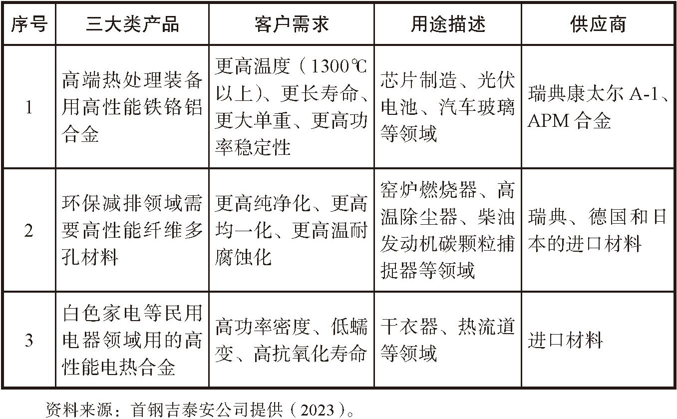 为了解第一手的客户需求,公司坚持让骨干技术人员定期走进客户技术开发部门和生产车间现场,同时邀请客户技术团队开展技术交流,找准细分领域客户需求。技术人员将客户需求整理后,形成用户需求资源池,并细分成内部若干个具体课题,为技术发展方向和定位提供支撑。2020年以来,首钢吉泰安先后走访了47家公司,厘清了下游客户需求主要聚焦三大类高端产品,发现相关产品所需材料国内均不能满足需求,而这三类产品均与首钢吉泰安的产线能力及公司现有产品发展方向高度匹配。客户聚焦的高端产品需求分类如表2-1所示。