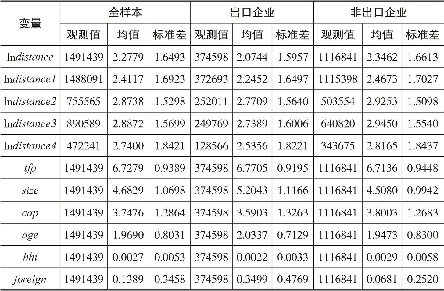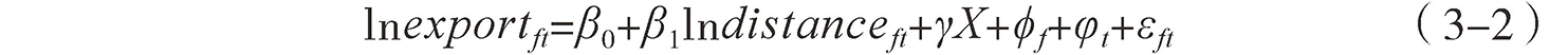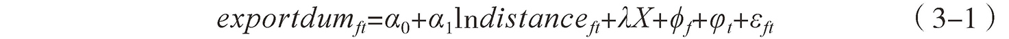 其中, f 、 t 分别表示企业和年份。式(3-1)用于检验银企距离对企业出口倾向的影响, exportdum 表示企业当年的出口状态虚拟变量,出口取值为1,否则为0;式(3-2)用于检验银企距离对企业出口规模的影响,ln export 表示企业出口销售额加1后的自然对数。ln distance 表示银企距离加1后的自然对数, X 为控制变量集; ϕ f 为企业固定效应, φ t 为年份固定效应, ε ft 为相应模型的随机误差项。为了控制企业固定效应,本章主要采用固定效应Logit模型对式(3-1)进行估计,采用OLS模型对式(3-2)进行估计。