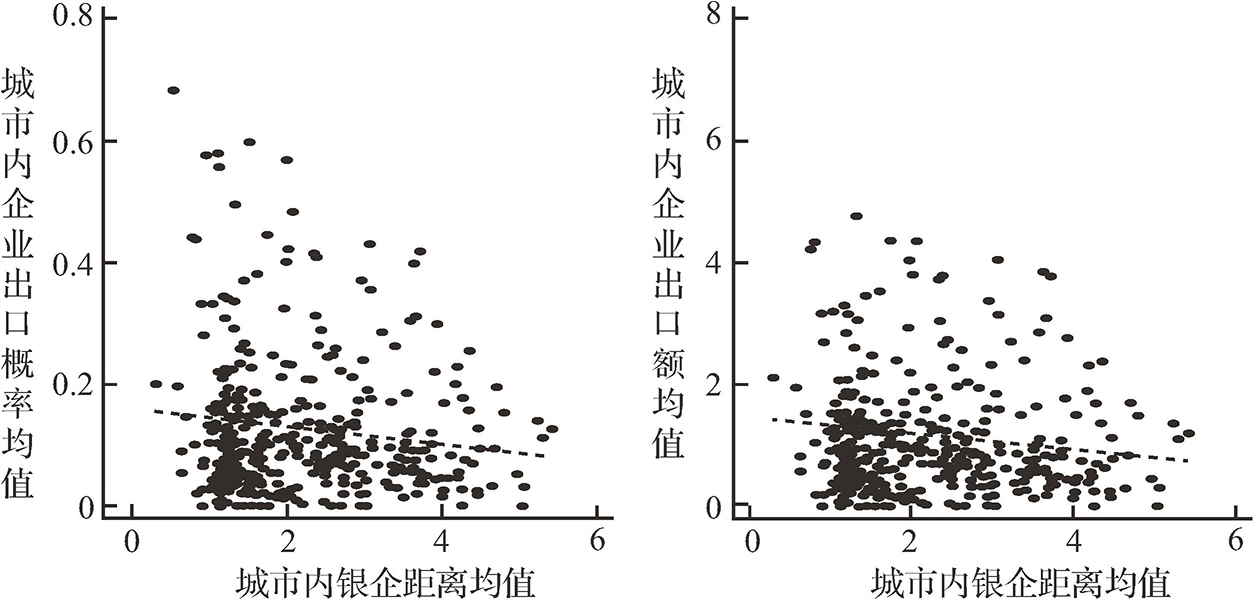 为了直观反映银企距离与企业出口行为的关系,此处绘制了城市内平均水平的银企距离(ln