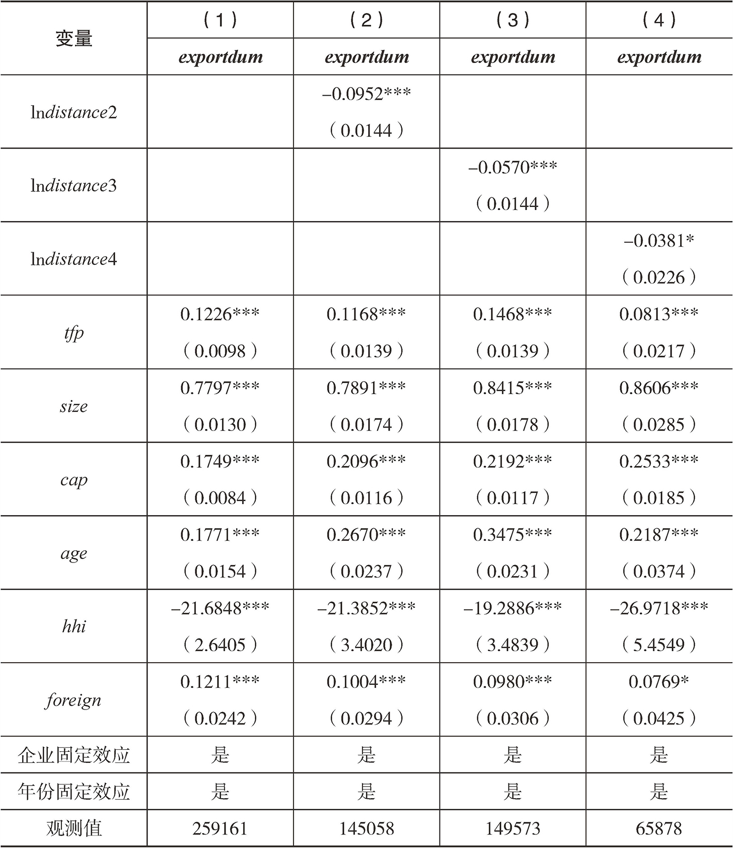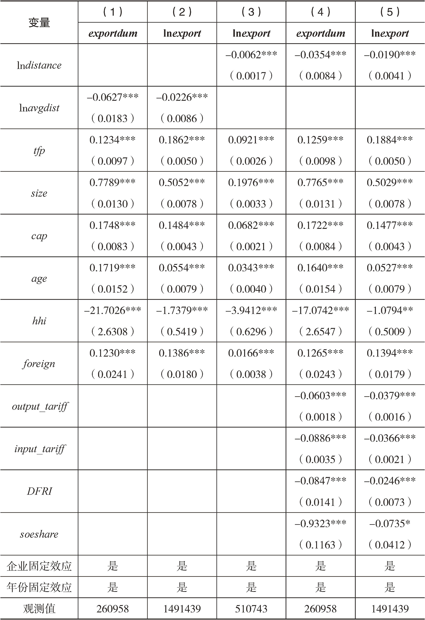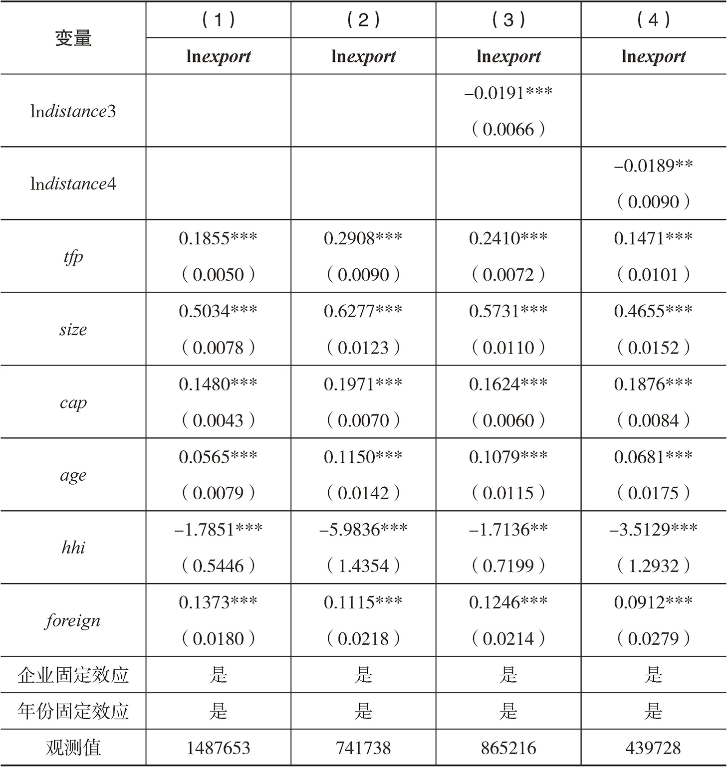 值得注意的是,在本章节样本期内中国同时进行了多项规模宏大、影响深远的政策改革,这些重大改革措施也可能会对企业出口行为产生影响。为了避免本章节的结论受这些政策冲击的影响,笔者在此对其进行控制。一是贸易自由化政策。自中国于2001年正式加入WTO后,以关税减免为主要形式的贸易自由化对中国企业的出口行为产生了重要影响(毛其淋和盛斌,2014;Fan et al.,2015)。二是外资自由化政策。为了履行加入WTO时所做出的承诺,中国在2002年对《外商投资产业指导目录》进行了大幅修改,在减少大量限制(含禁止)行业数目的同时增加了众多鼓励行业数目,由此带来的外资自由化对中国企业的出口行为产生了不可忽视的影响(Lu et al.,2017)。三是国有企业改革。在加入WTO前后时期明显提速的国有企业改革对促进市场竞争、提高企业经营效率起到了重要作用,可能也会因此影响企业的出口行为。为了控制这些政策效应,首先遵循Brandt et al.(2017)的做法,在基本计量模型中加入CIC4位码行业层面的最终品进口关税( output_tariff )和中间品进口关税( input_tariff );其次借鉴孙浦阳等(2015)的做法,在基本计量模型中加入根据《外商投资产业指导目录》规定的三类行业赋值加总后得到的外资自由化指标( DFRI ),该指标数值越大表明外资自由化程度越低;最后在基本计量模型中加入CIC4位码行业层面的国有资本份额( soeshare )。表3-9第(4)和第(5)列给出了控制贸易自由化、外资自由化和国有企业改革三项政策冲击后的结果,可以看出ln distance 的系数仍在1%水平下显著为负,再次印证了前文结论的稳健性。