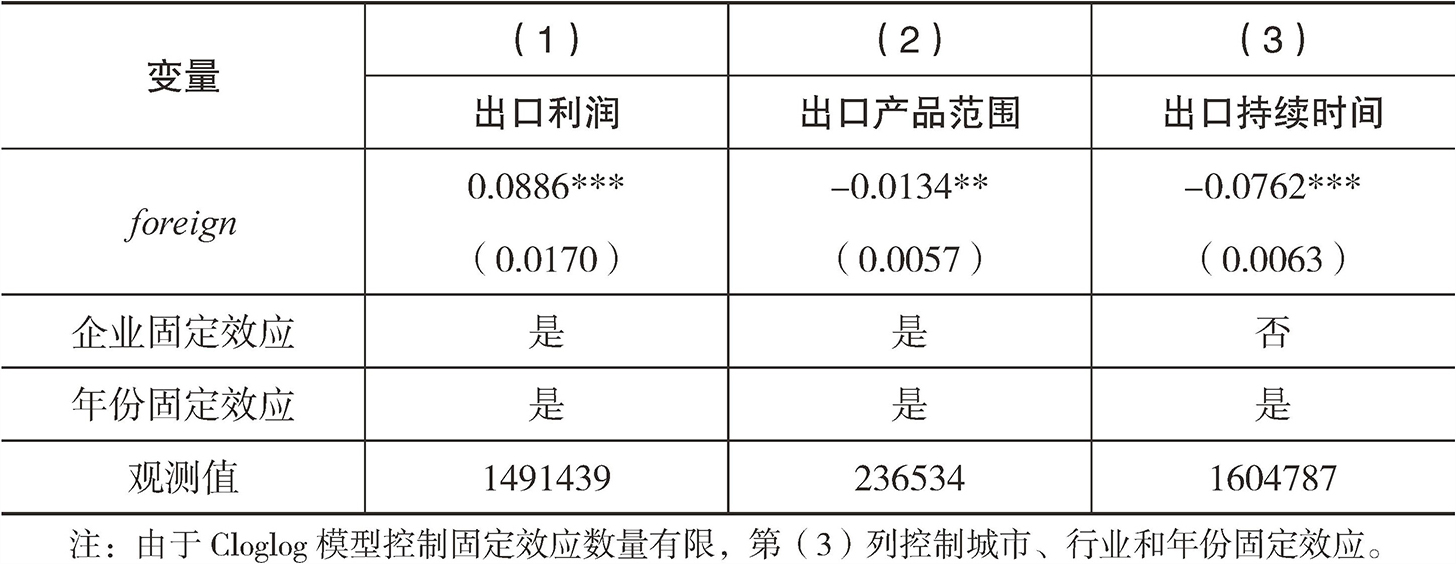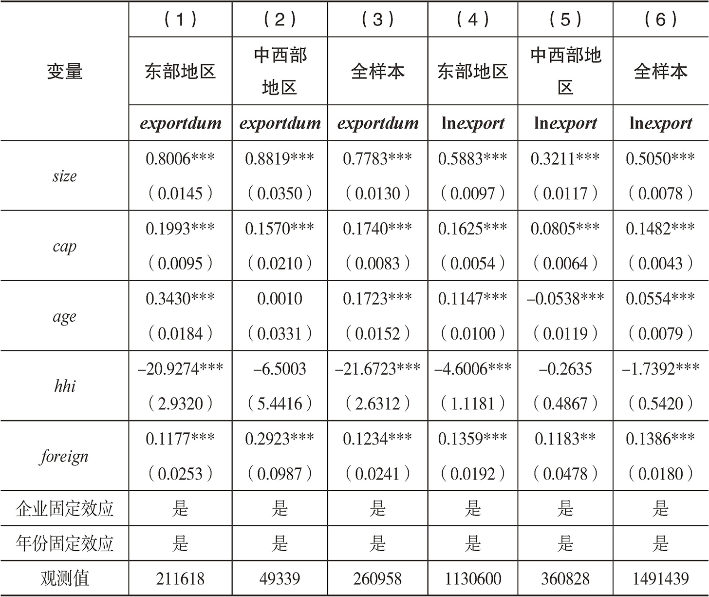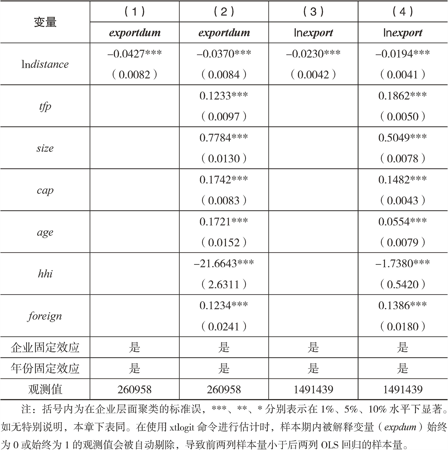 表3-2中第(2)列和第(4)列控制变量的回归结果符合已有关于企业出口行为检验的结论。全要素生产率( tfp )显著促进了企业出口倾向和出口规模的提高,符合以Melitz(2003)为代表的异质性企业贸易理论的研究结论;扩大企业规模( size )有利于促进企业出口,意味着企业出口行为存在显著的规模经济效应;企业资本密集度提高( cap )显著促进了企业出口,资本密集度较高的企业往往具有较高的劳动生产率和技术水平(樊海潮和郭光远,2015);企业存续年限( age )越长,企业出口概率和出口规模越大,表明成熟型企业更能发挥学习曲线效应;行业竞争加剧( hhi )有利于促进企业出口,表明国内市场的激烈竞争增强了企业开拓国际市场的动机;相比内资企业,外资企业( foreign )具有更强的技术溢出效应,因此具有更好的出口表现。