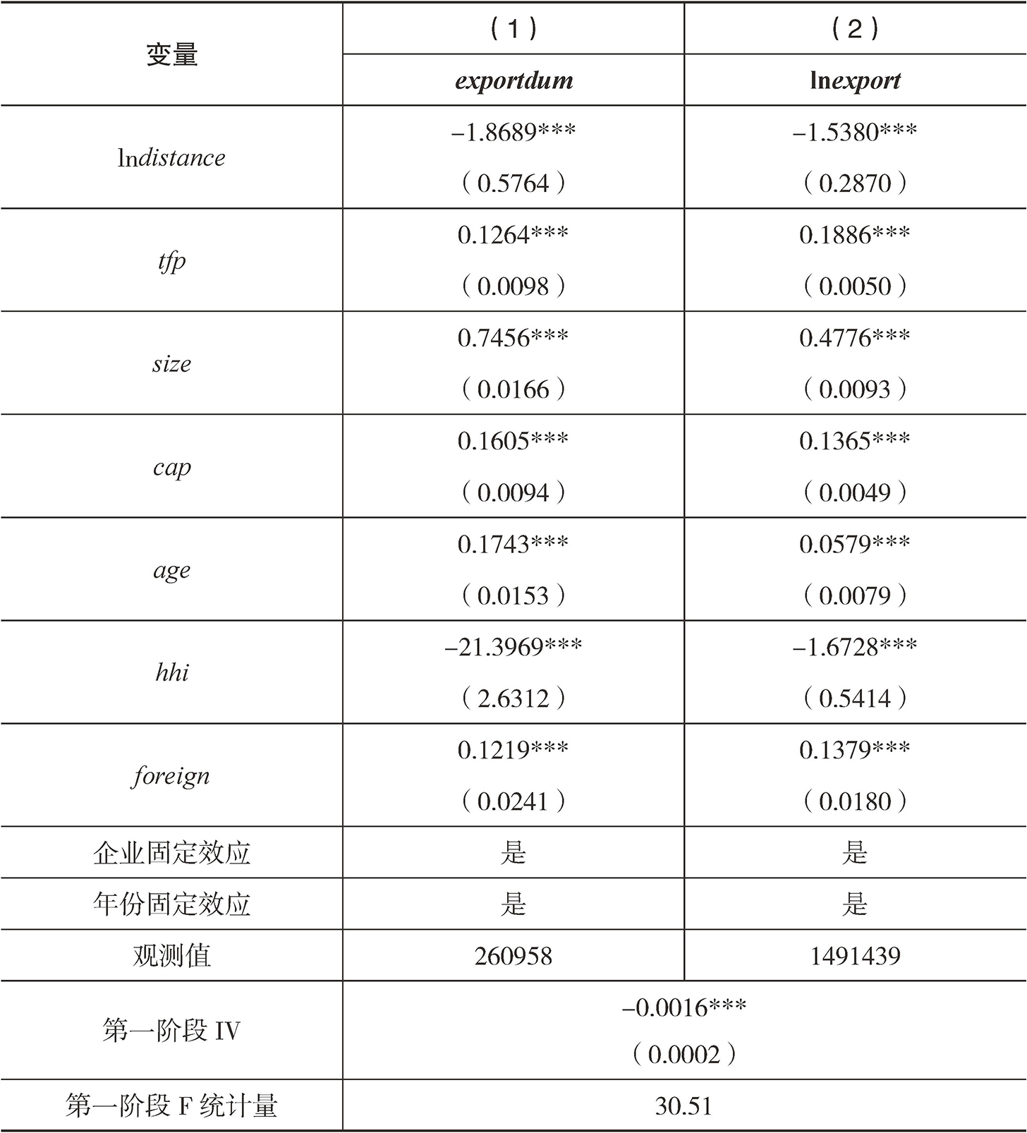 影响基准回归结果可靠性的一种担忧是:银行的网点布局可能受地区对外贸易发展水平的影响,企业为了出口融资便利也可能主动选址在金融发达地区,即前文可能存在由反向因果关系引致的内生性问题。对于这一问题,借鉴李志生等(2020)的思路,此处采用1937年城市的银行分支机构密度(城市的银行分支机构数量与地理面积之比)与年份的乘积作为银企距离的工具变量(IV)进行两阶段最小二乘(2SLS)估计