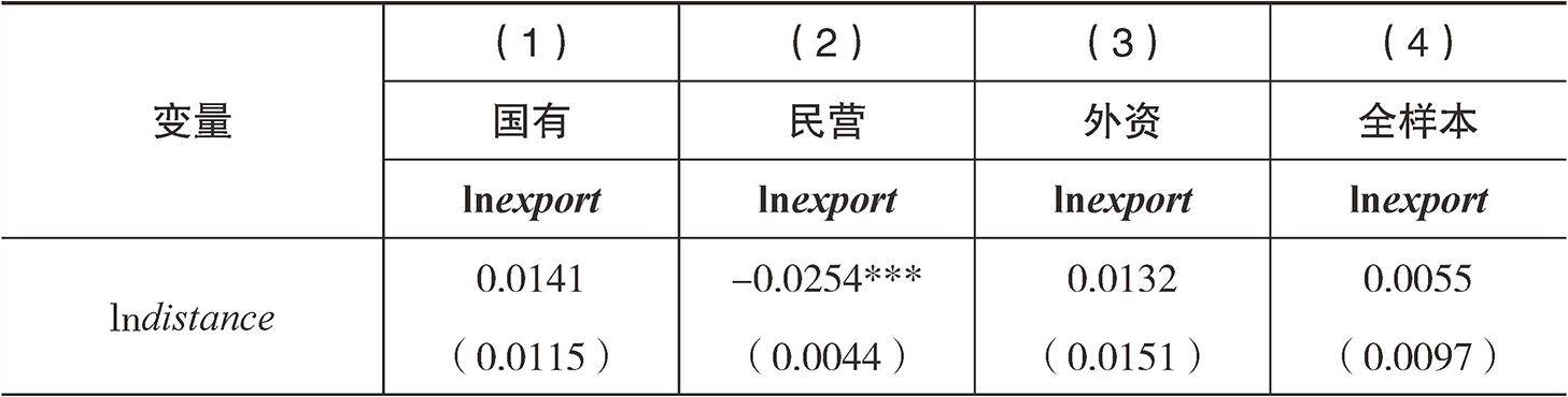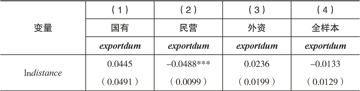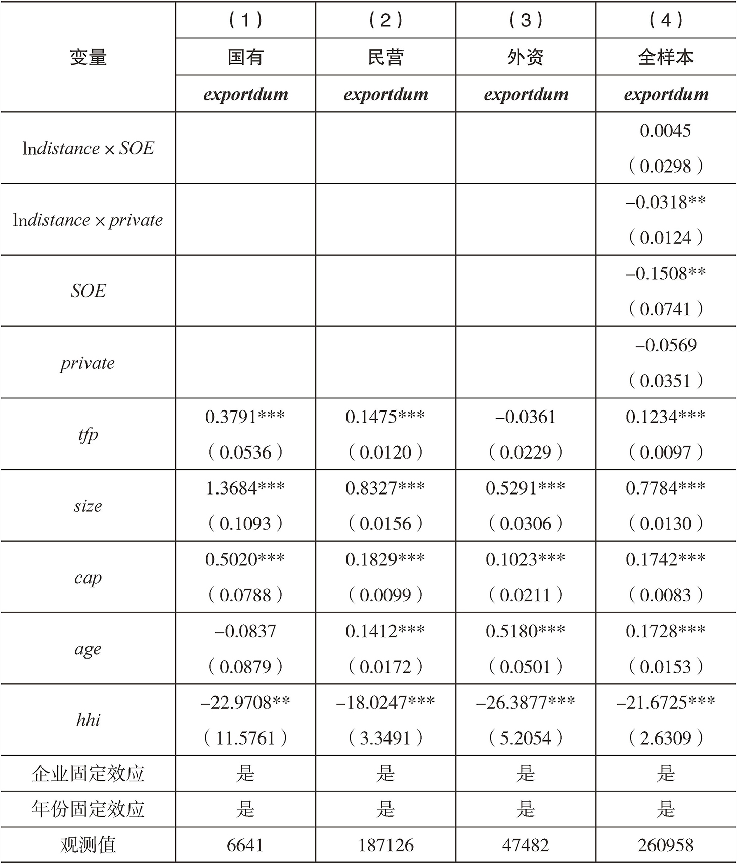 长期以来,金融资源错配构成了中国金融市场化改革面临的首要难题,金融资源的有效配置滞后于金融规模的高速增长。具体而言,商业银行在分配信贷资源时通常会优先考虑国有企业,民营企业的融资需求较难得到满足(Song et al.,2011;徐思远和洪占卿,2016)。偏向国有企业的金融资源分配制度造成了国有企业的预算软约束,而地方政府通过对本地银行的干预也造成了地方银行的预算软约束(陶锋等,2017)。显然,地方国有企业和金融机构的双重预算软约束具有较强的行政干预色彩,这种长期存在的银企关系随银企距离的变化而发生改变的可能性较小。而外资企业相比民营企业通常具有通畅的融资渠道,对地方银行信贷资金的依赖相对较小(Manova et al.,2015),因此我们推测缩短银企距离对国有企业和外资企业出口的影响较弱,但对面临较大信贷约束的民营企业出口的促进作用较强。表3-6和表3-7给出了按照企业实收资本相对份额区分企业所有制类型后的回归结果。从中可以看出,无论是在出口倾向的回归模型[表3-6第(1)-(3)列]还是在出口规模的回归模型[表3-7第(1)-(3)列]中,民营企业样本中银企距离的系数在1%水平下显著为负,国有企业和外资企业样本中银企距离的系数均未通过10%水平的显著性检验。这一结果验证了上述推断,即缩短银企距离对民营企业出口的促进作用更强。当然,本部分也在相应回归模型中纳入银企距离与国有企业虚拟变量的交互项(ln distance × SOE )、银企距离与民营企业虚拟变量的交互项(ln distance × private )来做进一步佐证,表3-6第(4)列和表3-7第(4)列的结果验证了上述分组回归结论的可靠性。