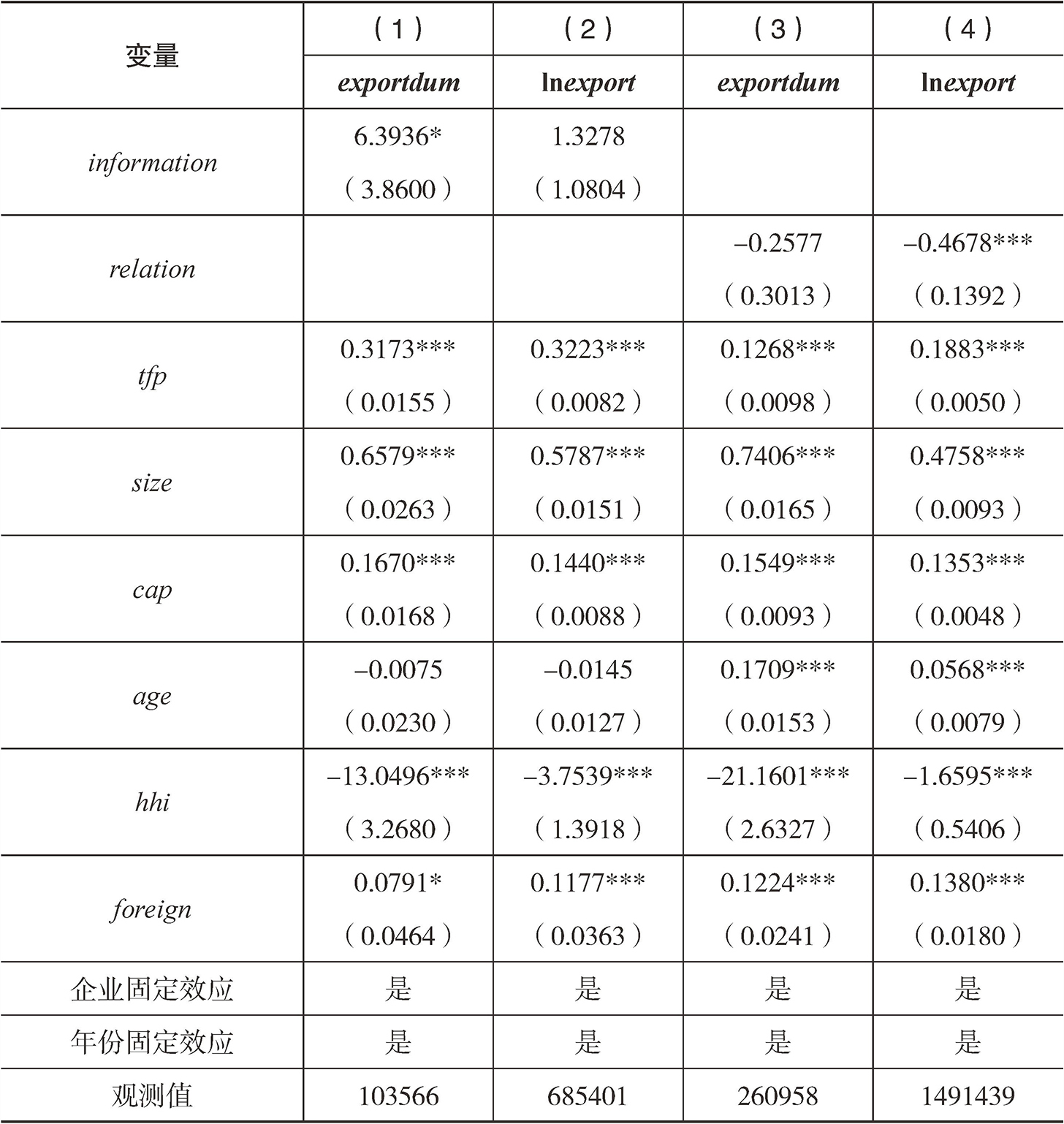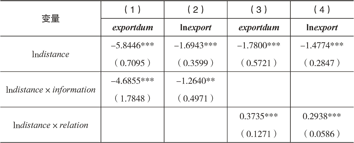 根据本章前文的理论分析,降低信息不对称和强化银企关系是银企距离缩短影响企业出口行为的两条作用机制。对于第一条机制,如果缩短银企距离通过降低信息不对称程度而促进了企业出口,那么可以推测在信息不对称越严重的企业中,缩短银企距离对企业出口的促进作用越强。对于第二条机制,如果缩短银企距离通过强化银企关系而促进了企业出口,那么可以推测在银企关系越弱的企业中,缩短银企距离对企业出口的促进效应越大;反之,如果缩短银企距离通过强化银企关系而抑制了企业出口,则可以推测在银企关系越弱的企业中,缩短银企距离对企业出口的促进效应相对更小。此处采用构建交互项的方法对上述影响机制进行检验。其中,信息不对称( information )用企业无形资产与总资产之比进行衡量(Ryan et al.,2014),无形资产比重越高,银行机构对借款企业进行价值评估的难度越大,银行面临的信息不对称水平也就越高;由于中国工业企业数据库对企业无形资产的统计年份截至2006年,此处对信息不对称渠道进行实证检验的样本区间为2000-2006年。银企关系( relation )采用企业长期借款与总负债之比进行衡量(Houston and James,2001),企业长期借款比重越高表明银企关系越强;囿于数据可得性,企业长期借款用长期负债近似代替。