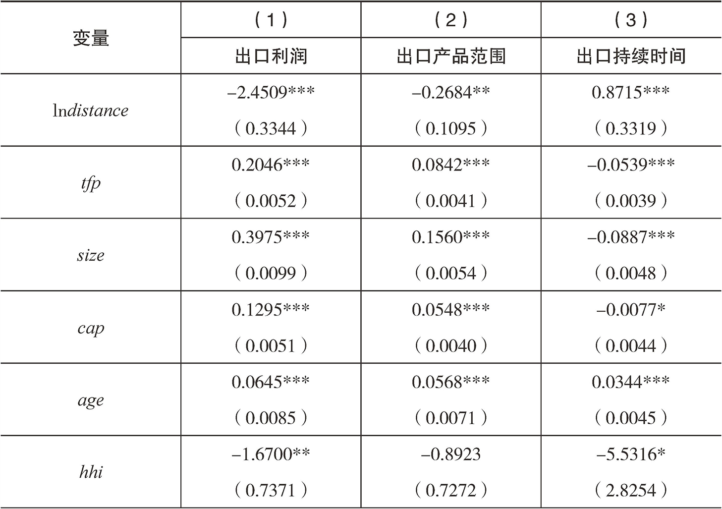 本章前文主要从出口倾向和出口规模两个角度考察了银企距离对企业出口行为的影响,为了更加全面地理解银企距离与企业出口的关系,此处进一步探究银企距离对企业出口绩效的影响。结合现有研究,本部分主要选取出口利润、出口产品范围和出口持续时间作为企业出口绩效的代理变量。其中,企业的出口利润用主营业务收入的利润率与企业出口额相乘后的自然对数近似代替(薛新红和王忠诚,2016),企业出口产品范围为企业当年出口的HS6位码产品种类数的自然对数,企业出口持续时间采用陈勇兵等(2012)的方法计算而得。需要说明的是,在计算企业出口产品范围和出口持续时间时,我们将样本与相应年份的中国海关贸易数据库进行了匹配。