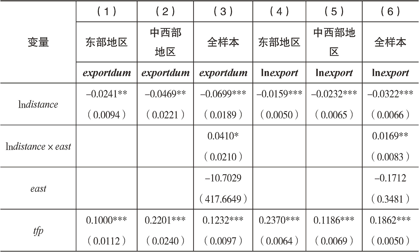 由于发展政策、地理位置及要素禀赋等方面的不同,中国各地区的经济发展表现出明显的区域差异,缩短银企距离对不同地区企业出口行为的影响也将有所不同。具体而言,东部地区的基础设施、信息技术、市场化程度等普遍优于中西部地区,在这种环境下,缩短银企距离的积极效应更易被先进的金融科技、人工智能等技术条件以及完善的产权保护、司法保护等制度安排所替代。此外,东部地区的互联网金融、商业信用、直接融资等金融市场的发展水平也高于中西部地区,位于该地区的出口企业具有更多的融资渠道,对银企距离变化的敏感性可能相对更低。据此我们推测,缩短银企距离对东部地区企业出口的促进作用应该小于中西部地区。表3-8给出了区分企业所在地区后的回归结果
