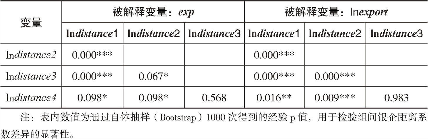 表3-3和表3-4报告了区分银行类型后银企距离影响企业出口的估计结果。从中可以看出,无论是在出口倾向还是在出口规模的回归模型中,ln distance1 的系数均未通过10%水平的显著性检验,ln distance2 、ln distance3 和ln distance4 的系数至少在10%水平下显著为负,且系数的绝对值大小依次递减。当然,为了进一步从统计意义上确认各组之间银企距离的系数是否存在显著性差异,此处利用Bootstrap法进行组间系数差异性检验,结果如表3-5所示。从中可以看出,无论是在出口倾向还是在出口规模的回归模型中,仅有ln distance3 和ln distance4 之间的系数差异未通过10%水平的显著性检验,表明缩短企业距城市商业银行的地理距离与缩短企业距农村商业银行的地理距离对企业出口的促进效应没有显著差异。综上所述,这些结果表明缩短企业距股份制商业银行的地理距离对企业出口的促进作用最强,其次是城市商业银行和农村商业银行,国有大型商业银行最弱,该结论基本符合上述理论预期。