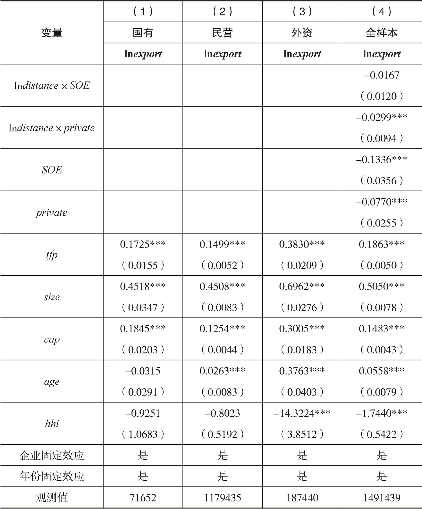 。由于不同性质的商业银行在服务实体经济的对象、能力和效率上存在显著差异,在探讨银企距离对企业出口行为的影响时有必要对银行类型进行区分。国有商业银行是典型的大银行,其在贷款决策中更加注重企业抵押品价值、财务报表、信用评级等“硬”信息(Berger and Black,2011),这些信息基本可以通过更加先进的技术手段(如通信技术、人工智能等)以及更加完善的披露制度获取,而无须依赖于银企距离的缩短。相比之下,城市商业银行和农村商业银行都是区域性中小金融机构,前者的市场定位是服务地方经济、城市市民和中小企业,后者的市场定位则是服务“三农”和小企业(刘明康,2009),其核心竞争力均在于地缘优势;一方面,地缘优势的发挥在较大程度上有赖于银企距离的缩短;但另一方面,受自身规模和管理水平限制,缩短企业距该类银行的距离所能增加的信贷供给相对有限,银企距离缩短的出口促进效应可能会因此被弱化。区别于上述三类银行,股份制商业银行在公司治理、风险管理、盈利能力和产品服务等方面具有独到的经营优势,其业务范围和服务对象更加多元化和差异化,既能服务大企业又能服务中小企业,但其分支机构的覆盖率和渗透率相对较低,在这种情况下缩短企业距股份制商业银行的距离能够有效强化其优势、弥补其劣势,从而能够为出口企业融资提供更加坚实的保障。因此我们推测,缩短企业与股份制商业银行分支机构之间的地理距离的出口促进效应理应更强,城市商业银行和农村商业银行次之,国有大型商业银行相对最弱。